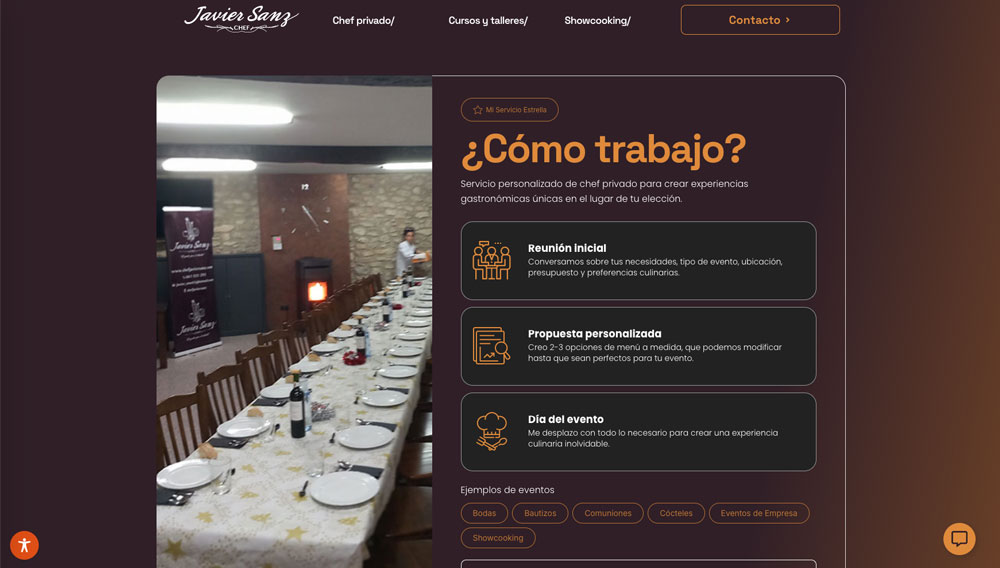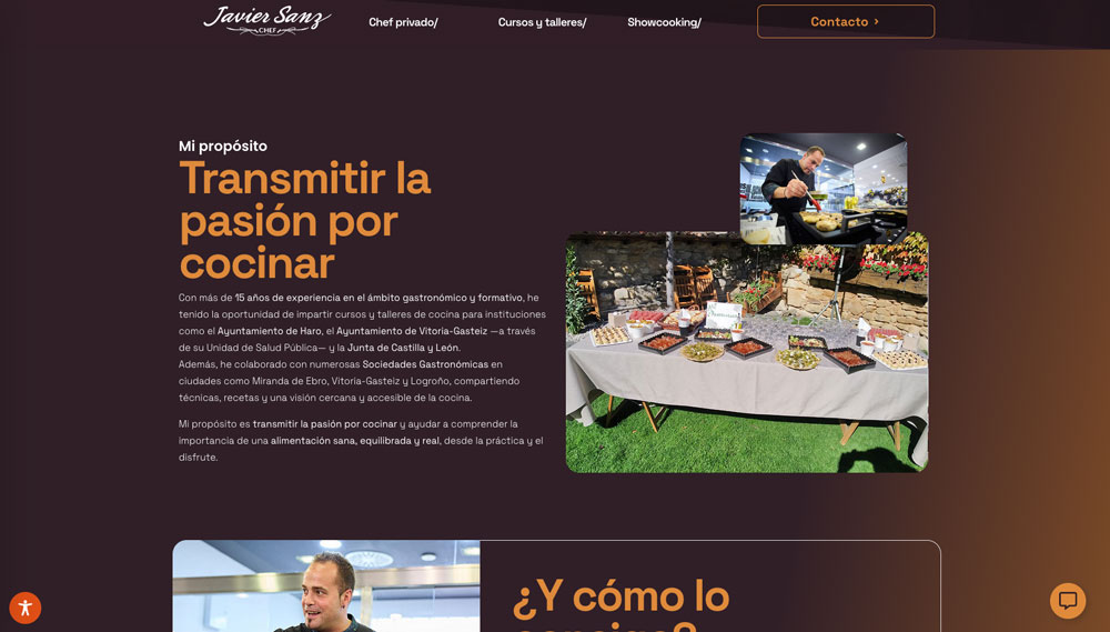 Se ha trabajado especialmente la narrativa del proyecto, reforzando la figura del chef como elemento central de la marca, generando confianza y diferenciación frente a otros servicios similares. La estructura de la web facilita la comprensión de la propuesta y dirige al usuario hacia la conversión de forma clara.